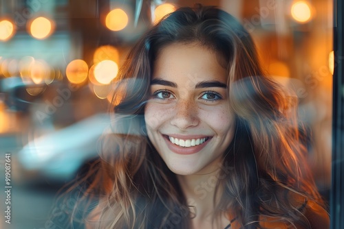 Captivating Smile Behind a Glass Window with Warm Bokeh Lights