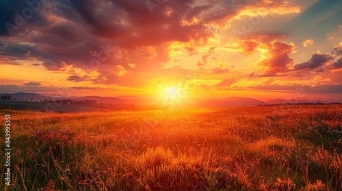 Captivating summer sunset with a brilliant orange sun, vibrant clouds, and sunlight creating a breathtaking view over the landscape