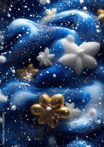 Captivating Winter Wonderland: Blue and White Frosted Snowflake and Floral Design with Gold Highlights in Frozen Artistic Display