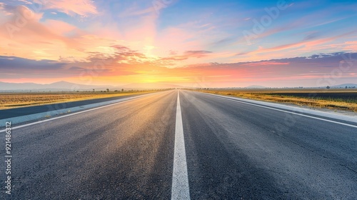 Capture a deserted highway at sunrise, with the sky glowing in soft hues and the road leading into the unknown.