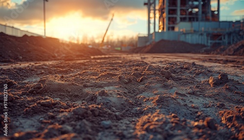 Capture a dramatic low-angle shot of a construction site, focusing on a foreground of rich, textured dirt with a flat .