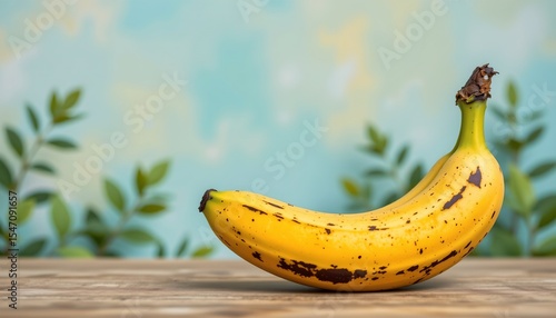 capture a high resolution image of a single ripe banana placed at the bottom of the frame, leaving ample copy space at the top for text or graphics.