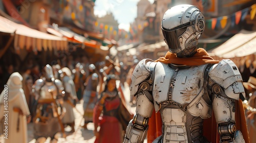 Capture a high-angle view of a futuristic robotic knight engaging in sword combat at a historical Renaissance fair, blending elements of advanced technology and medieval aesthetics in a digital photor