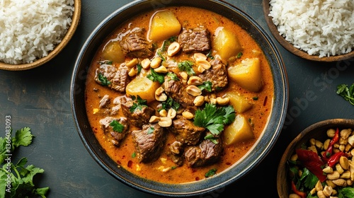 Capture a rich and creamy massaman curry with beef, potatoes, and peanuts, served in a traditional bowl with rice on the side, symbolizing comfort food.