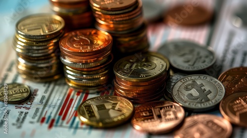 Capture colorful stacked coins with a financial chart background, close-up, focus on the texture of the coins, vibrant, Composite, featuring graphs and data