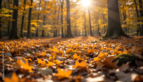 Capture the essence of fall with this serene autumn forest scene. Sunlight pours through trees onto a bed of golden leaves, creating a warm, peaceful atmosphere. Ideal for use in seasonal campaigns, n