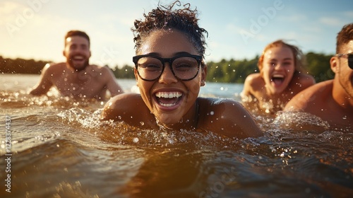 Capture the essence of summer with joyful friends splashing in a clear blue lake under the warm golden hour glow The water droplets sparkle, reflecting lighthearted happiness as they laugh and play