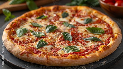 Capture the tantalizing details of a freshly baked Neapolitan pizza, showcasing its golden crust, bubbling cheese, and aromatic basil leaves.