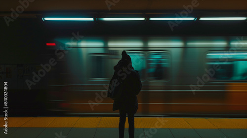 Captured from behind, a person stands at the metro platform's edge as a train speeds by, generating a dynamic effect with motion blur.