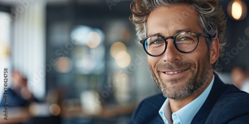 Captured in moment of sheer joy and accomplishment mature businessman with ageless charm stands proudly face lit up with radiant heartfelt smile that speaks volumes of journey to success