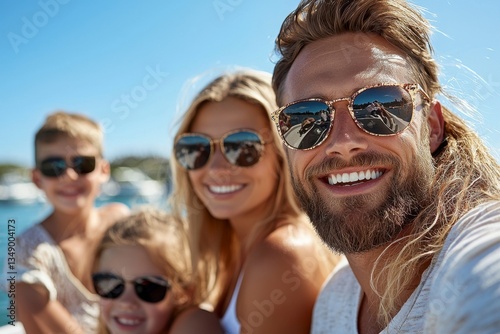 Captured in the golden light of vacation bliss, a young couple and their two radiant children share an unforgettable boat ride experience The calm lake reflects their joy as they embrace a tranquil