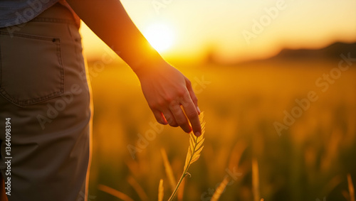 Capturing Rural Serenity: Woman's Hand Touching Grass in a Sunset Field - Embrace Natural Beauty with Photo Stock Concept and Ample Empty Space for Your Design