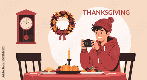 thanksgiving, man, dinner, photo, camera, food, family, celebrate, autumn, together, male, seasonal, fall, table, indoor, happy, lifestyle, cheerful, meal, tradition, holiday, gathering, gratitude, festive, home, illustration, cartoon, decoration, clock, chaplet, leaf, pumpkin, vegetable, dining, digital, modern, celebration, atmosphere, season