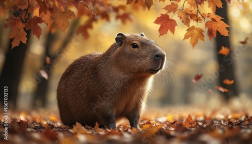capybara, animal, rodent, wildlife, nature, forest, autumn, fall, leaf, leaf, park, outdoors, bokeh, cute, portrait, fur, whisker, mammal, brown, season, october, november, foliage, tree, timberland, ground, warm, sunlight, natural, tranquil, adorable, fauna