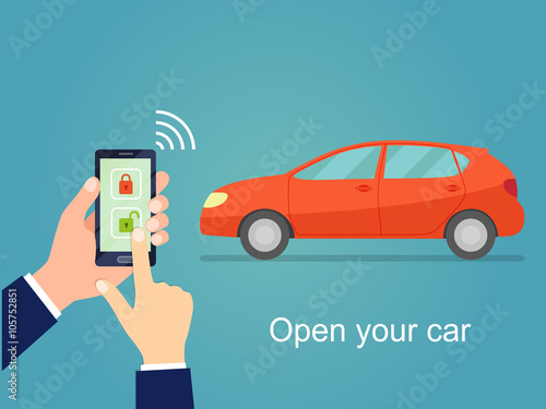 Car door lock and unlock by smartphone. Flat vector illustration