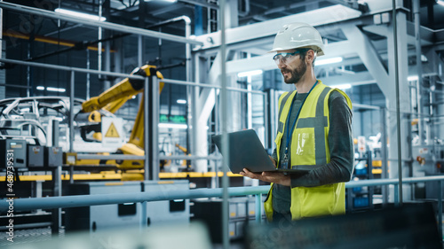 Car Factory: Male Automotive Engineer Wearing Hard Hat, Standing, Using Laptop. Monitoring, Control, Equipment Production. Automated Robot Arm Assembly Line Manufacturing Electric Vehicles