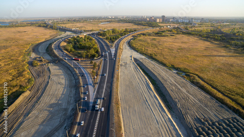 highway, transport, city landscape, building, house, city, street, track, sky, machine, traffic, interchange, flyover, bridge, region, horizon, morning, grass, green, railway, lake, duck pond, aerial, automobile, russia, rostov, don, travel, road, construction, repair, drone, sand