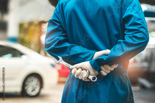 Car Mechanic Ready For Work. Auto Mechanic with Large Wrench in Hands. Ideas How to Fix the Problem.Male mechanics at the garage fixing a car.Closed up focus .
