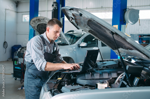 car mechanic using a computer laptop to diagnosing and checking up on car engines parts for fixing and repair.