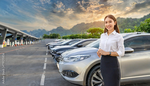 Car parked at outdoor parking lot. Used car for sale and rental service. Car insurance background. Automobile parking area. Car dealership and dealer agent concept. Automotive industry