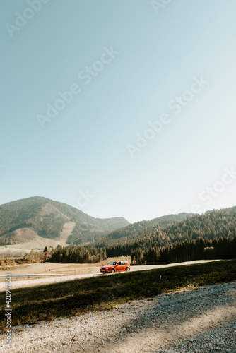 Car parked on roadside in mountain valley landscape, Hallstatt, Upper Austria
