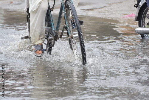 Car passing through a flooded road, flood caused by torrential rains. Flooded city road with a large puddle. Splash by car through flood water. A car is driving on a wet road with raindrops on its tir