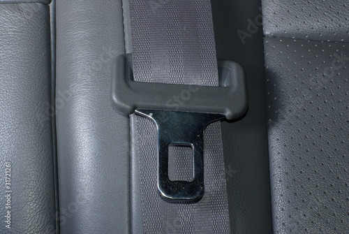 Car seatbelt on the grey leather