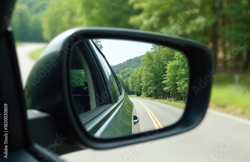 car, mirror, road, driving, travel, vehicle, automobile, highway, driver, journey, trip, nature, forest, green, side, rear, view, asphalt, tree, mountain, window, sky, rural, wood, foliage, motion, speed, drive, explore, vacation, leisure, relax, scenic, beautiful, sunny, summer, fresh, natural, peaceful, calm, open, winding, adventure, freedom, get-away, destination, holiday, outdoors, perspective