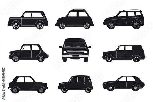 Car silhouettes, various models, side and front views, white background, design
