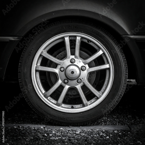 Car wheel. Black and white, metal spokes, tire texture, dark background and shadow
