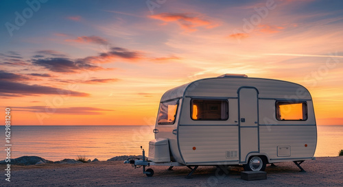 Caravan camping near ocean at sunset offers unforgettable holiday, perfect for adventure. Caravan provides comfort and freedom to explore. Enjoy a caravan camping holiday, for unforgettable memories.