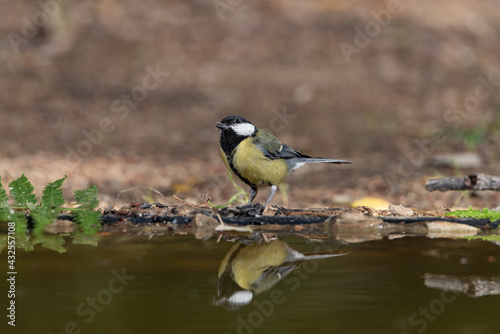 carbonero común bebiendo en el estanque del parque (Parus major)
