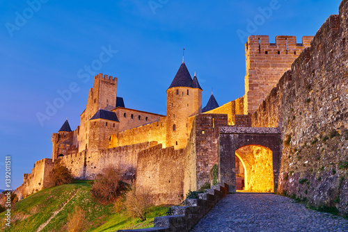label, art, building, castle, city, dusk, evening, facades, grass, historic site, history, landscape, middle-ages, morning, nature, plant, sky, tour tourism, tower, tree, turret, carcassonne, france, mediaeval, architecture, fortress, europa, old, wall, travel, ancient, fort, palace, fortification, stone, historic
