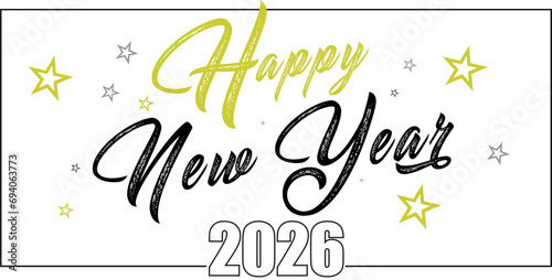 Card design with handwritten inscription 2026 plus golden stars and the inscription happy new year. EPS vector illustration
