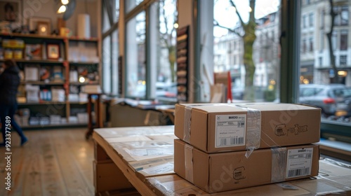 Cardboard boxes and furniture near stairs in office. Moving day. startup office receiving merch boxes.