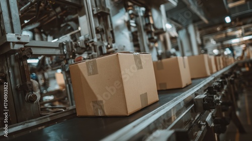 Cardboard boxes moving along a conveyor belt in a modern warehouse setting, showcasing automated packaging and efficient logistics operations in a manufacturing environment.