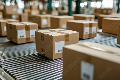 cardboard, box, conveyer, belt, warehouse, shipping, logistic, distribution, delivery, package, parcel, brown, tape, label, barcode, metal, industrial, automation, factory, manufacturing, production, transportation, movement, system, process, efficiency, economy, commerce, business, order, fulfillment, online, retail, consumer, client, service, product, good