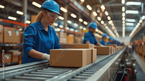 Cardboard boxes on conveyor rollers ready to be shipped by courier for distribution.Packed courier on production line against cardboard boxes in warehouse.Worker in a warehouse in the logistics sector