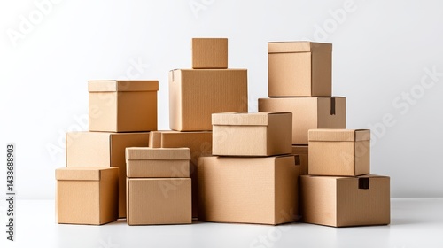 Cardboard Boxes Stacked for Shipping - A collection of various sized cardboard boxes neatly stacked against a white background. Perfect for moving, storage, or shipping concepts