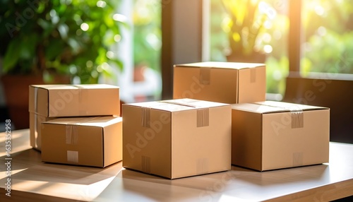 Cardboard boxes stacked on a light-colored wooden table in a bright room with plants and sunlight