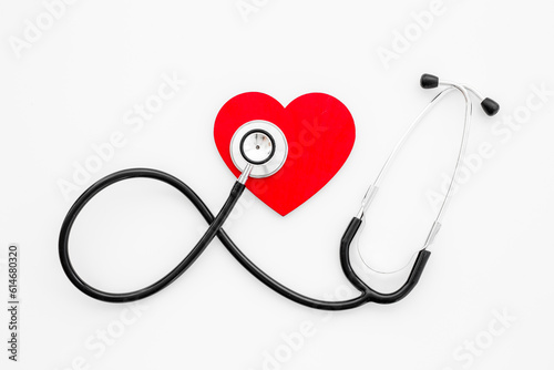 Cardiology and insurance concept with red heart and medical stethoscope