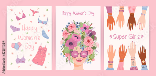 Cards with cute female illustrations. Vector set for Happy Womens Day, 8 march and other