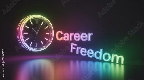 Career freedom concept with glowing clock and vibrant neon text for new business ventures