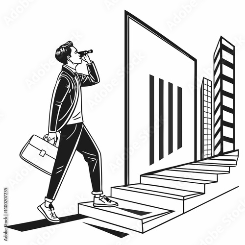 man, stair, doorway, binocular, briefcase, building, city, urban, outdoors, illustration, monochrome, graphic, vector, retro, vintage, stylised, businessman, architecture, looking, walking, climbing, observing, searching, viewing, exploring, ambition, opportunity, future, vision, career, progress, discovery, aspiration, journey, direction, uncertainty, determination, hope, curiosity, sharpened, anticipation, seriousness, black, white, greyscale, line, shape, shadow