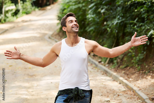 Carefree guy in vest, smiling and looking up