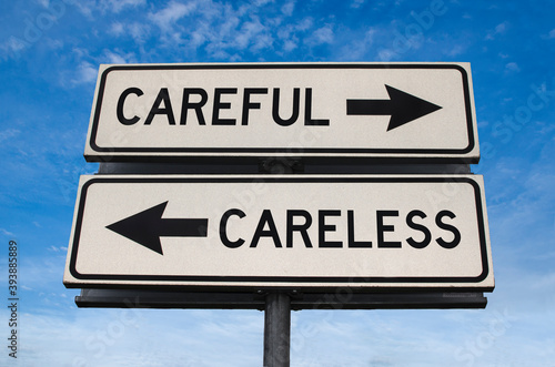 Careful versus careles road sign. White two street signs with arrow on metal pole with word. Directional road. Crossroads Road Sign, Two Arrow. Blue sky background. Two way road sign with text.
