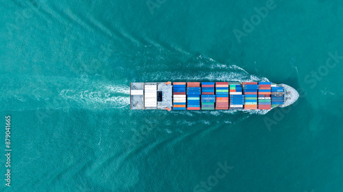 Cargo container ship carrying container and running in the ocean near international container port customs shipyard sea port concept smart logistic service. transportation logistics trading..