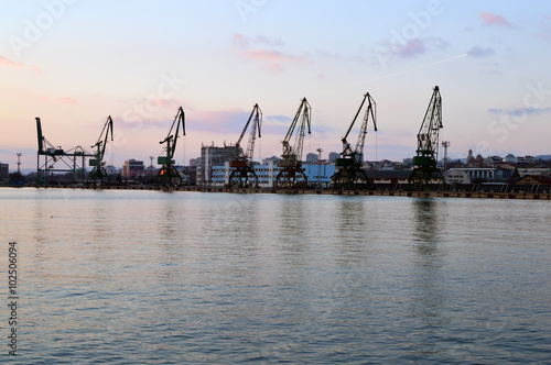 Cargo docks with dark cranes’ silhouettes after sunset, Varna Harbor, Bulgaria