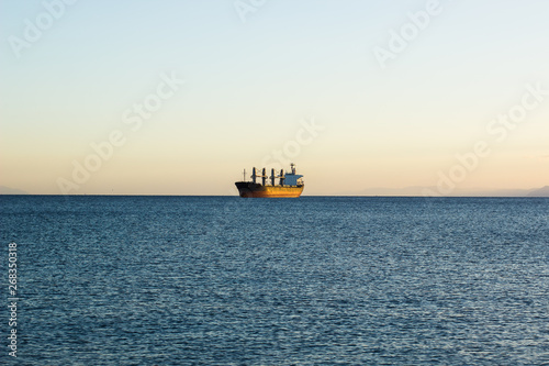 cargo industrial ship in Atlantic ocean water environment scenery landscape, idyllic transportation simple picture with empty copy space for text