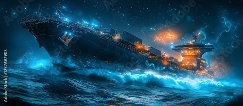ship, ocean, storm, night, cargo, science fiction, sea, wave, water, vessel, container, dark, dramatic, fantasy, futuristic, glowing, light, maritime, mystery, power, rough, sailing, space, starry, technology, transport, travel, turbulent, underwater, voyage, adventure, alien, blue, cosmic, deep, energy, exploration, galaxy, nebula, night time, oceanic, sky, star